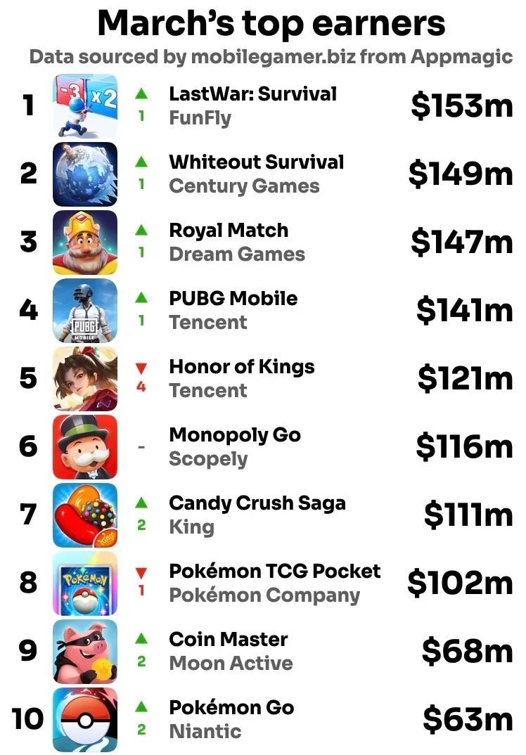 近日,外媒Mobilegamer.biz发布了2025年3月的全球手游收入榜。(注:数据来源AppMagic,统计范围不包括第三方安卓渠道、网页商店及广告收入,且已扣除平台分成)