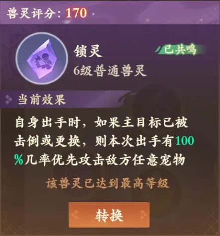 外加上锁灵这个兽灵,比如队伍宝宝集火一只清完,有可能随机打到对方人物上会导致送怒或者不痛不痒的浪费输出回合,那么就能弥补这项缺陷,能一直把伤害打到对方宝宝上不会造成输出浪费的情况,所以强烈推荐满共鸣情况这样搭配非常的巴适。