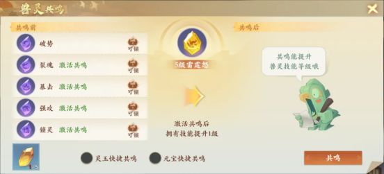 特殊兽灵到达5级后点击共鸣,会进入共鸣界面,激活后可以让共鸣的普通兽灵等级提升1级。