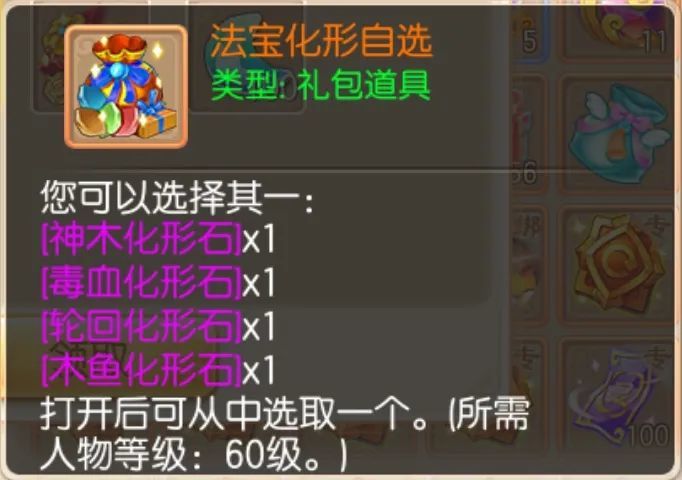 85级冲级礼:100000金币、募灵玉*20、神兽碎片*20、募灵石*150、稀有法宝化形自选*60、普通法宝化形自选*150;95级冲级礼:120000金币、募灵玉*20、神兽碎片*20、募灵石*150、稀有法宝化形自选*60、普通法宝化形自选*150;99级冲级礼:120000金币、募灵玉*20、神兽碎片*20、募灵石*200、稀有法宝化形自选*70、普通法宝化形自选*200。