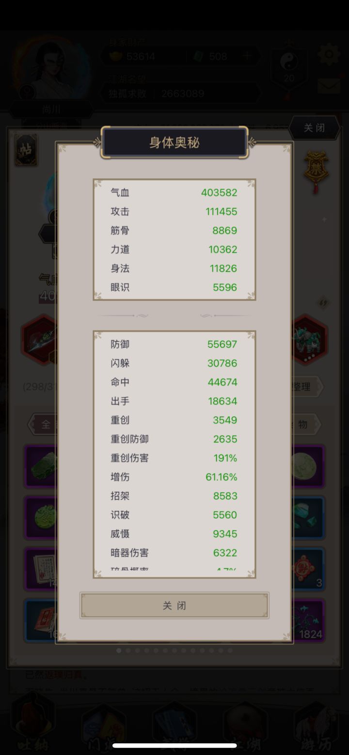 弟子: 重中之重,弟子好不好完全是两种过图体验。弟子血防都磨励了一半,命中都99。棍腿满出招,拳80出招,刀剑枪均50左右出招。
