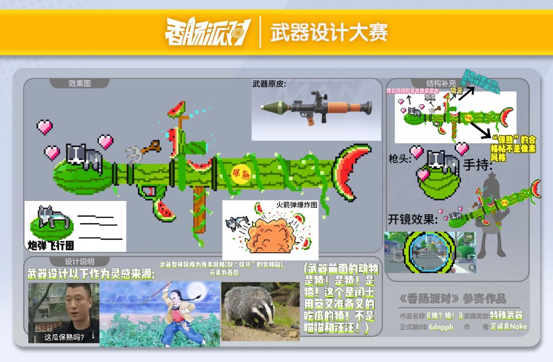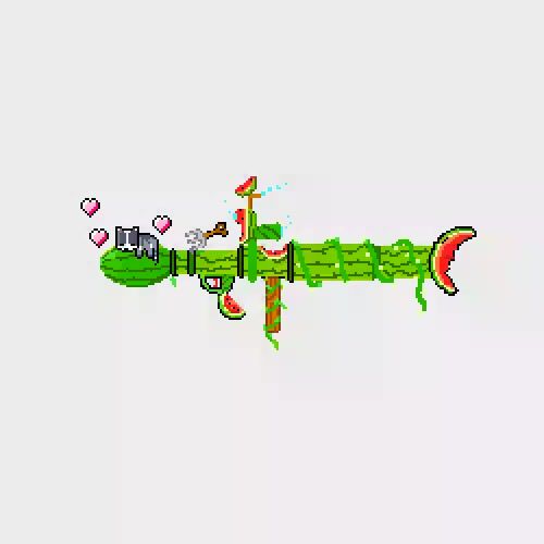 皮肤主体以绿色为基调,一根茁壮的西瓜藤,藤蔓缠绕其上,自然且生动。RPG前端趴着一只刚刚逃过了闰土追杀而已经饿趴下,但看到瓜又感到很开心猹,它机警的模样为皮肤增添俏皮感。几片西瓜切片错落分布在枪炮中部,鲜红的瓜瓤与翠绿外皮相互映衬,视觉效果强烈。醒目的“保熟”的合格帖,让你感到放心,因为你接下来不会挨刘某强刀劈。