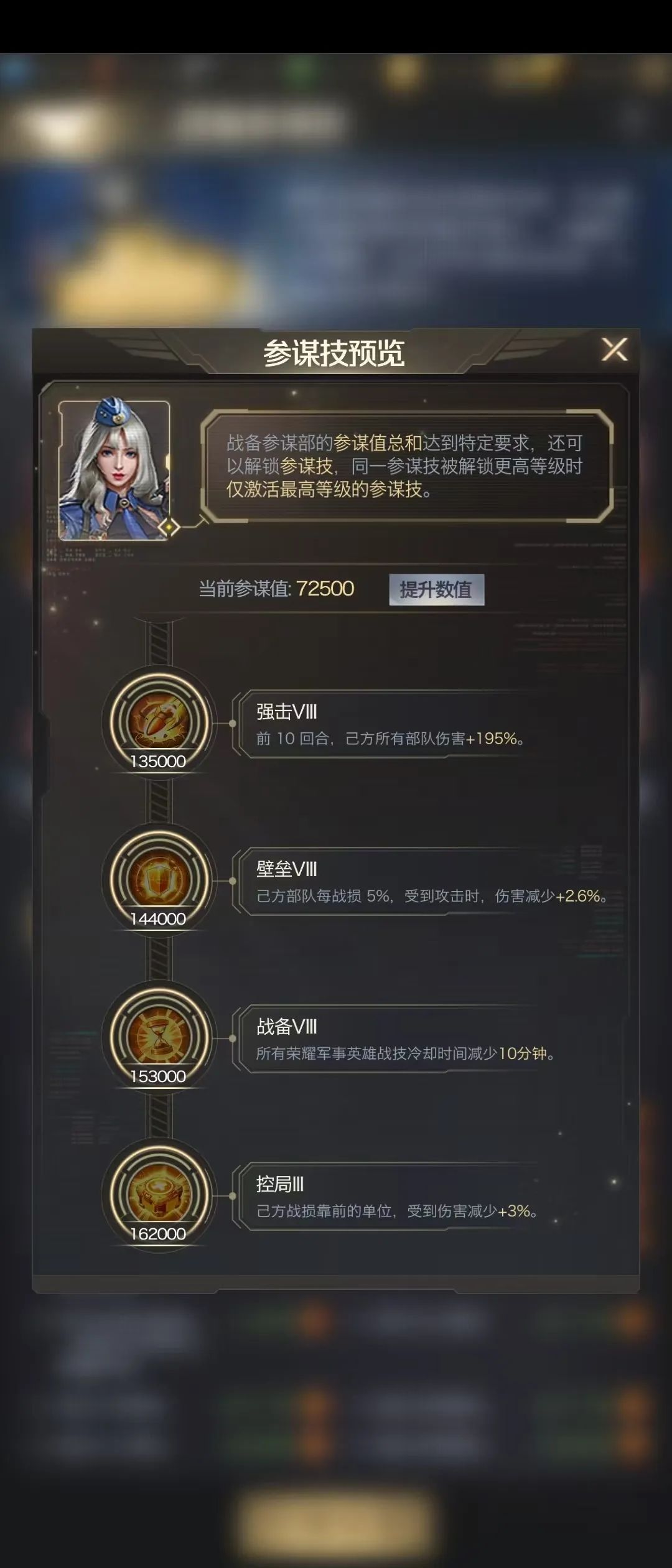 任命在战备参谋部时,集结战斗开始前,若集结全队出征攻城车数量不低于集结部队总数5%,自身出征数量最多的攻城车单位在命中远程单位时,降低目标攻击、防御、生命【7.20%+1.00%*战备参谋部中