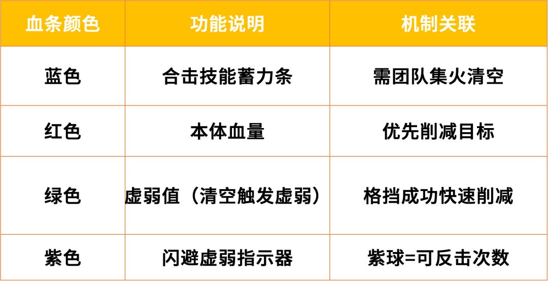 蓄力即将结束时找准时机格挡,单人成功即全队生效。连续触发两次,成功格挡可大幅提高虚弱值,虚弱值清空时BOSS将陷入虚弱,此时攻击效率翻倍!