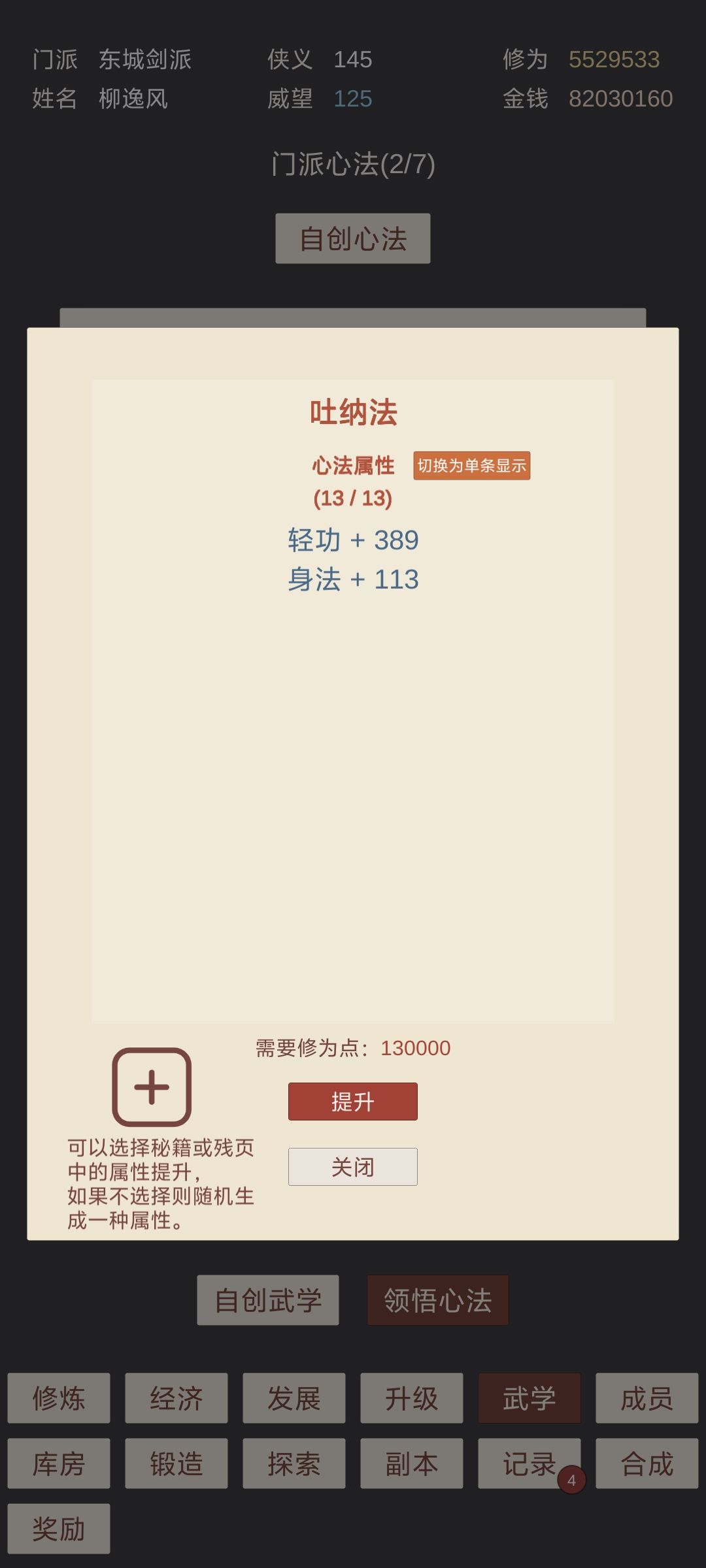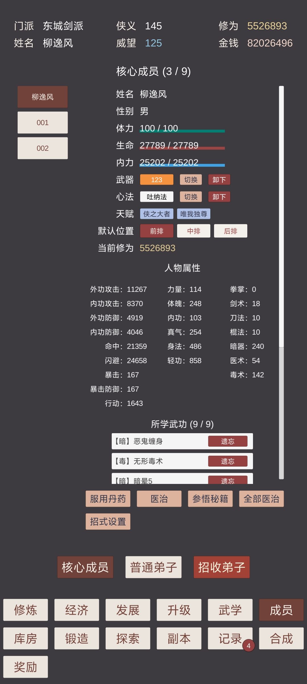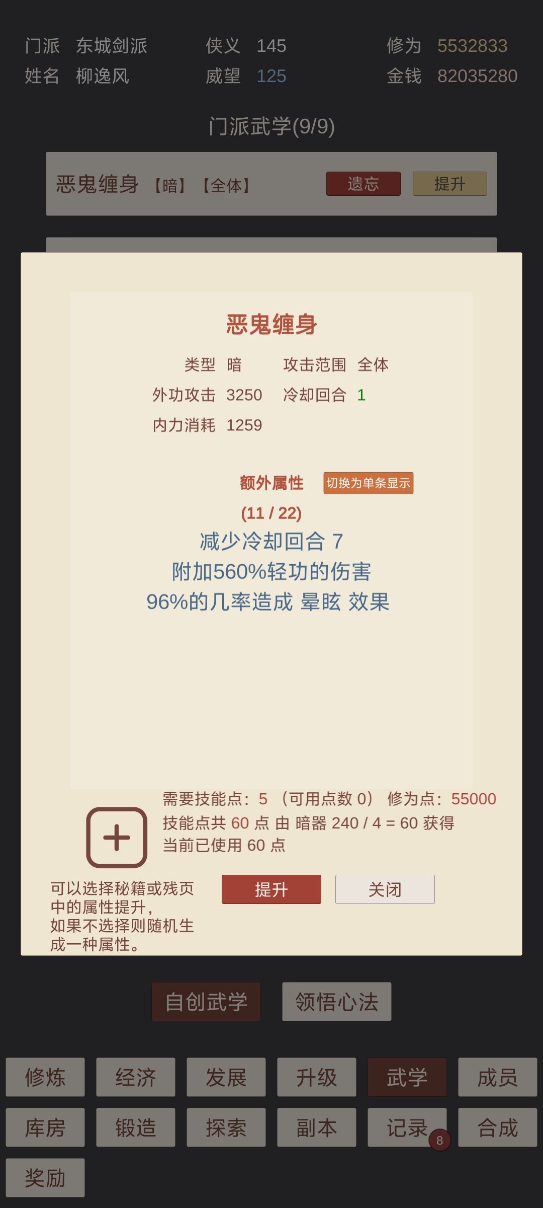 主打一个先手控制,属性碾压,快速结束战斗,心法主加轻功,辅身法;毒术第一个减少行动力,其他减体魄百分比,减轻功百分比;招式2个,百分百晕眩,7个减少回合,其余配轻功附加伤害,伤害杠杠的;武器配回内回血,吸血,可为永动机。一个把星期可通关。
