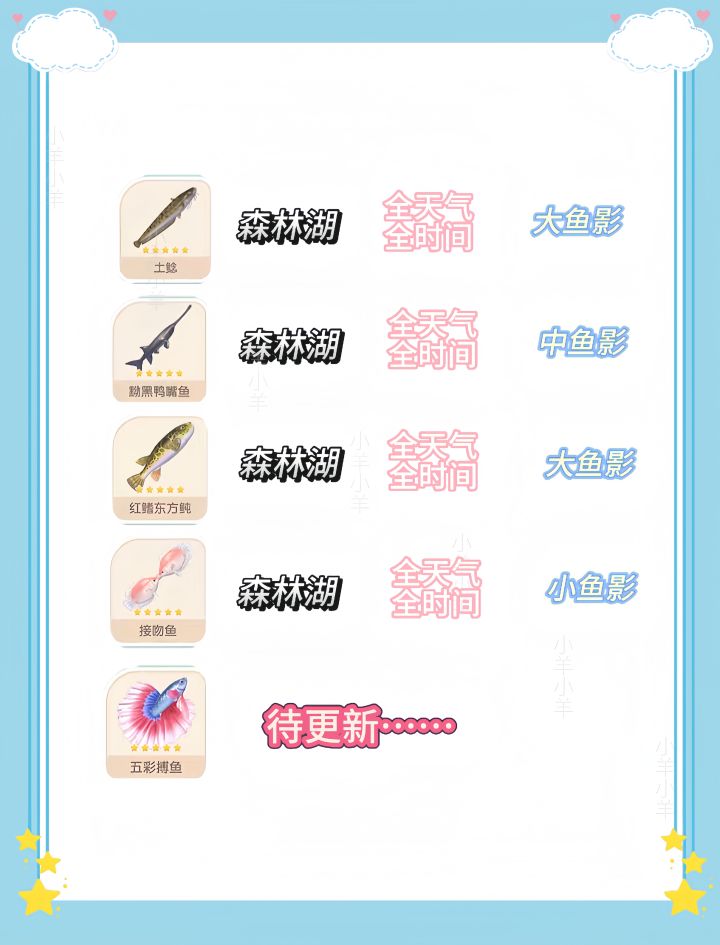 目前解锁了前4只鱼,全部都是在森林湖能钓到,全