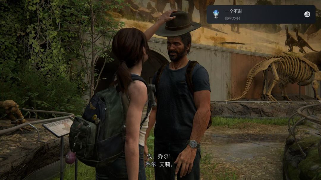- 艾莉第一天生日礼物回忆篇,进博物馆大门后右手边拿一顶帽子,和随便3个恐龙互动后提示可以和乔尔互动,给他戴上帽子后解锁。这里建议可以留着最后做全成就截图用