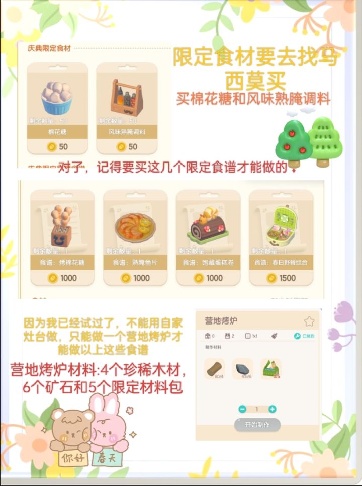首先先去找马西莫买限定食材(棉花糖和熟腌调料),记得要先去买这4个初始的限定菜谱才行(这次也是不能使用自家的灶台制作,需要注意)需要自己制作营地烤炉,手册0级可制作