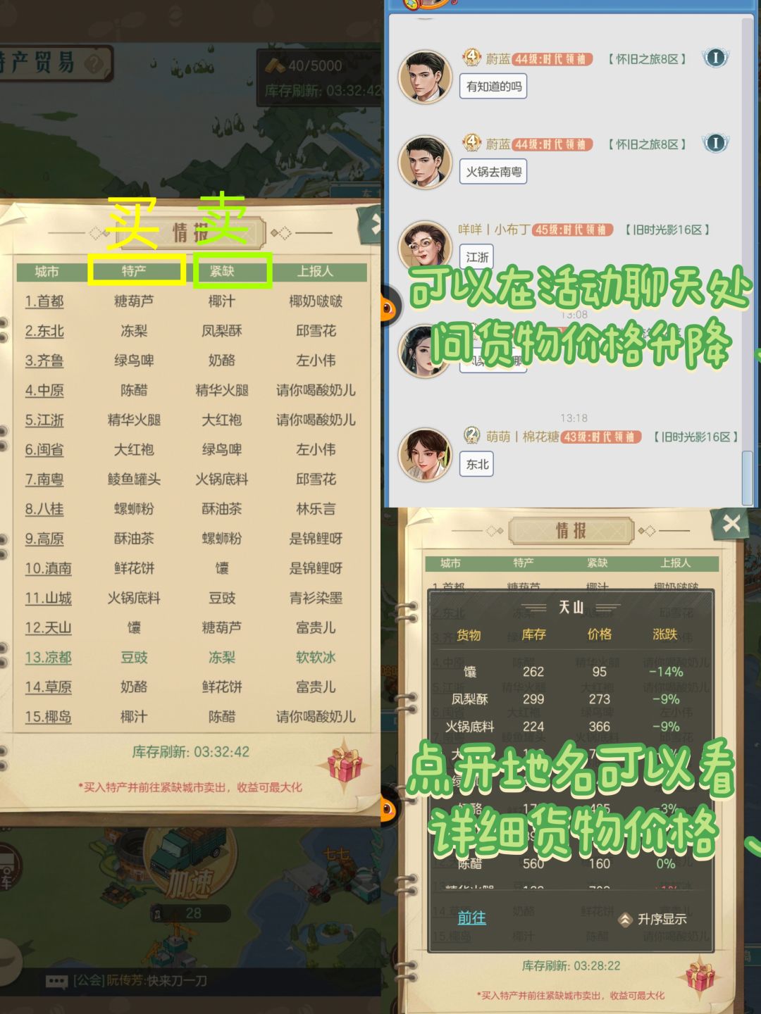 ①抢新低价特产库存(-15%+),卖高价稀缺物(15%+)。每天的14点以及18点,特产贸易都会更新库存和商品价格,所以我们尽量保证在特产库存刷新的前一会到,便于抢到低价商品特产库存/卖出好价钱。
