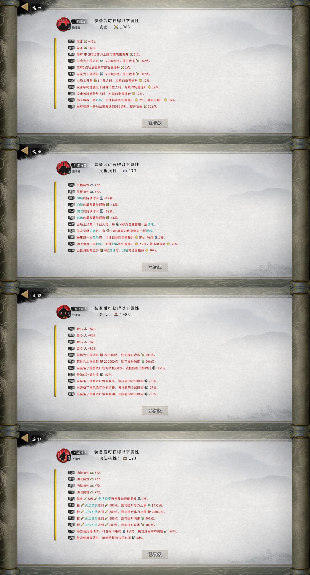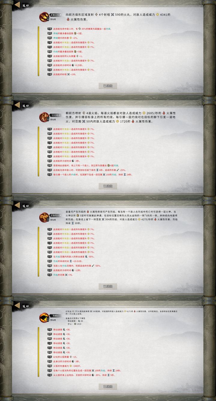其中火丸术,需走灼烧流才能配合分元地火,但是可以给燃魂两个词条(燃魂层数和燃魂伤害提升),虽然火丸术触发效果已经选择了灼烧,但是可以通过火密卷来将灼烧转燃魂来得到燃魂层数(可以看图4火密卷词条),燃魂是提供自身增伤的,做到鱼和熊掌兼得!其他技能词条没特别要强调,图中词条是我压缩到极致的状态,除非必要词条外,锦上添花的一律没要,喜欢直接粗暴的道友照搬即可!