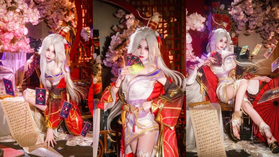 第三张图片中,coser坐在一处古雅的地方,姿态闲适。她的一腿优雅地交叠,露出精致的高跟鞋和脚踝处的装饰。金色的链条与珠串缠绕在脚踝上,随着她的动作轻轻晃动,发出细微的声响,仿佛在演奏着一曲优雅的乐章。手中的卡牌在她的摆弄下,似乎有了生命一般。周围飞舞的卡牌,更是增添了几分奇幻的色彩。背景中的红色油纸伞和散落的花瓣,营造出一种浪漫而闲适的氛围。coser微微仰头,眼神中透露出一种慵懒与优雅,仿佛在享受着这片刻的宁静。长长的卷轴在她身旁铺开,上面的文字仿佛在诉说着古老的故事。整个画面充满了诗意,让人仿佛置身于一个梦幻的世界中,感受着不知火舞花合斗皮肤所带来的独特魅力。