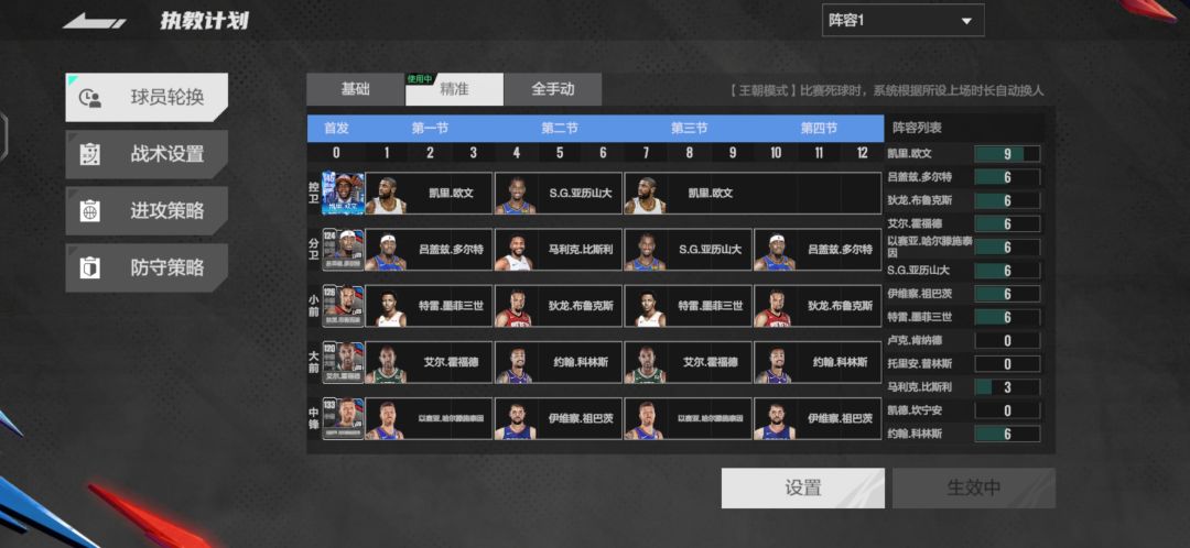 再就是如果你想高效点经理上分,最好是手动换防一下对位人,比如对面pg是吉迪,sg是瓦格纳之类的,想打你的小个子球员,你就让多尔特或者狄龙这种防守好的去对位吉迪,瓦格纳这种甚至可以让4号位去对位,新秀欧文这种也最好让多尔特这类的去对位,这样可以最大限度的去限制对面主攻手得分,一旦防住,打防守反击还是容易的。