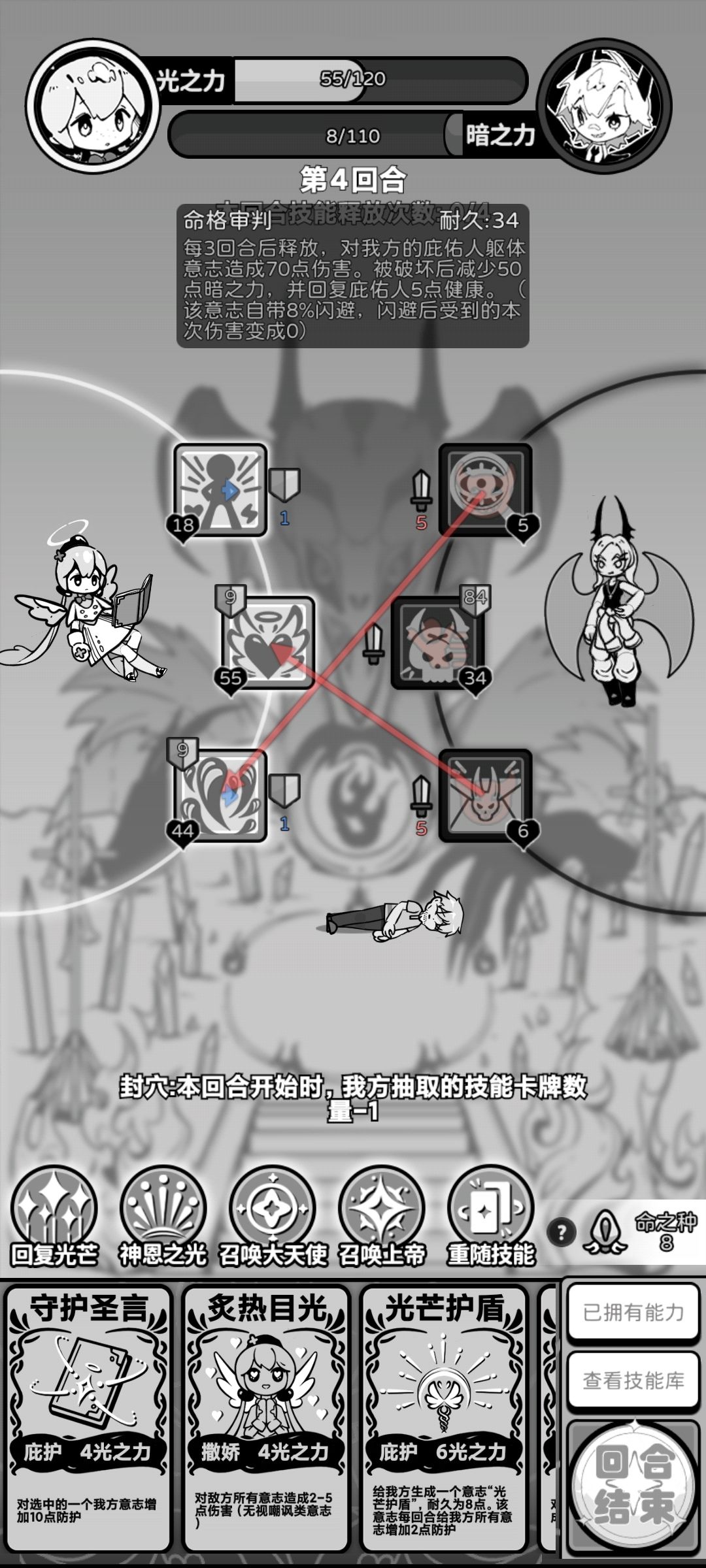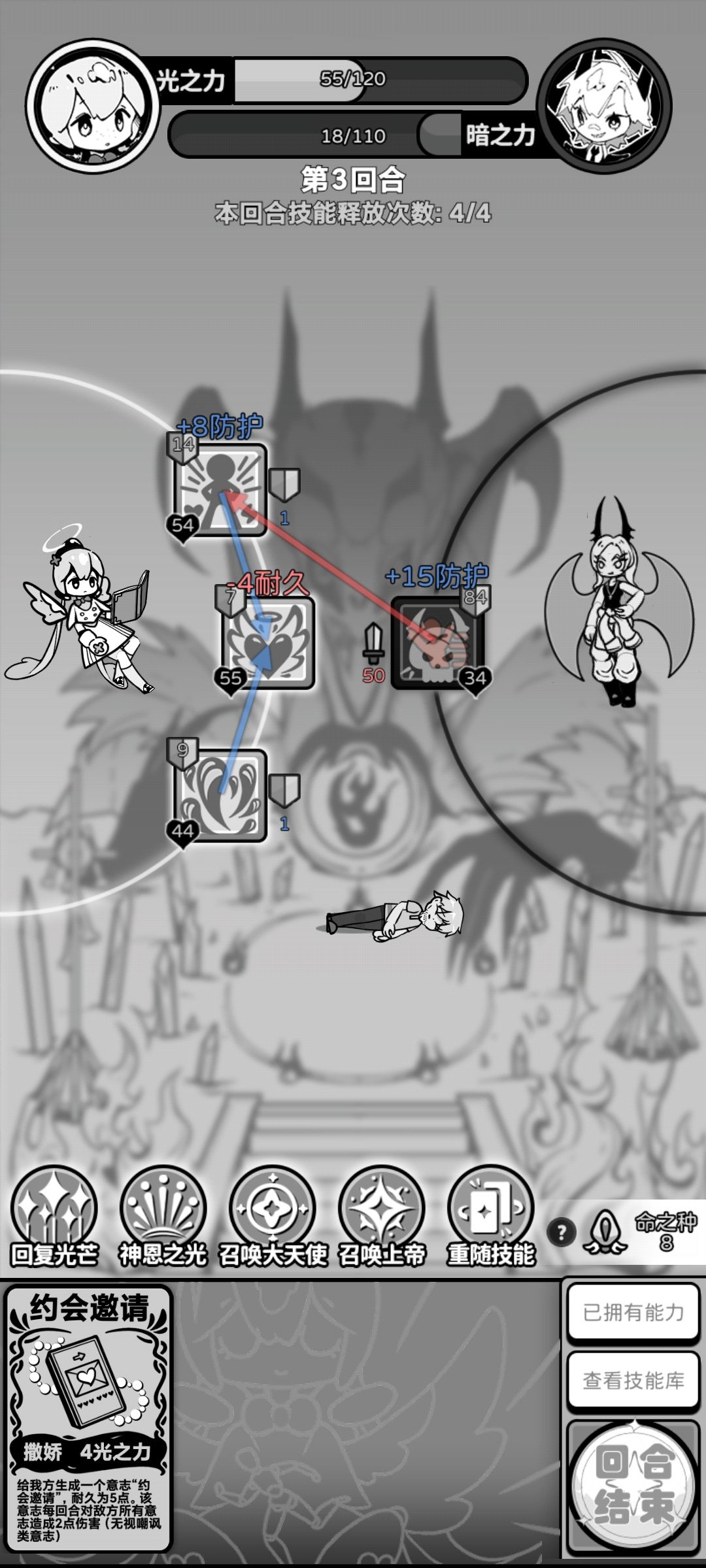 召唤物不吃被动增益,无论是邀约还是光盾,新人使用注意这点。突然发现光盾改为每回合为所有意志加两点防护。