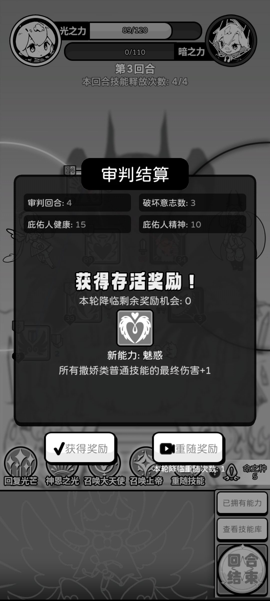 赢了之后获得颂歌,活到了80岁暗之力满了,没想到不进入战斗,到了87岁才进入战斗,太好了!再赢了看广告获得魅惑,努力撑到99岁上天堂。发表被动纪念。