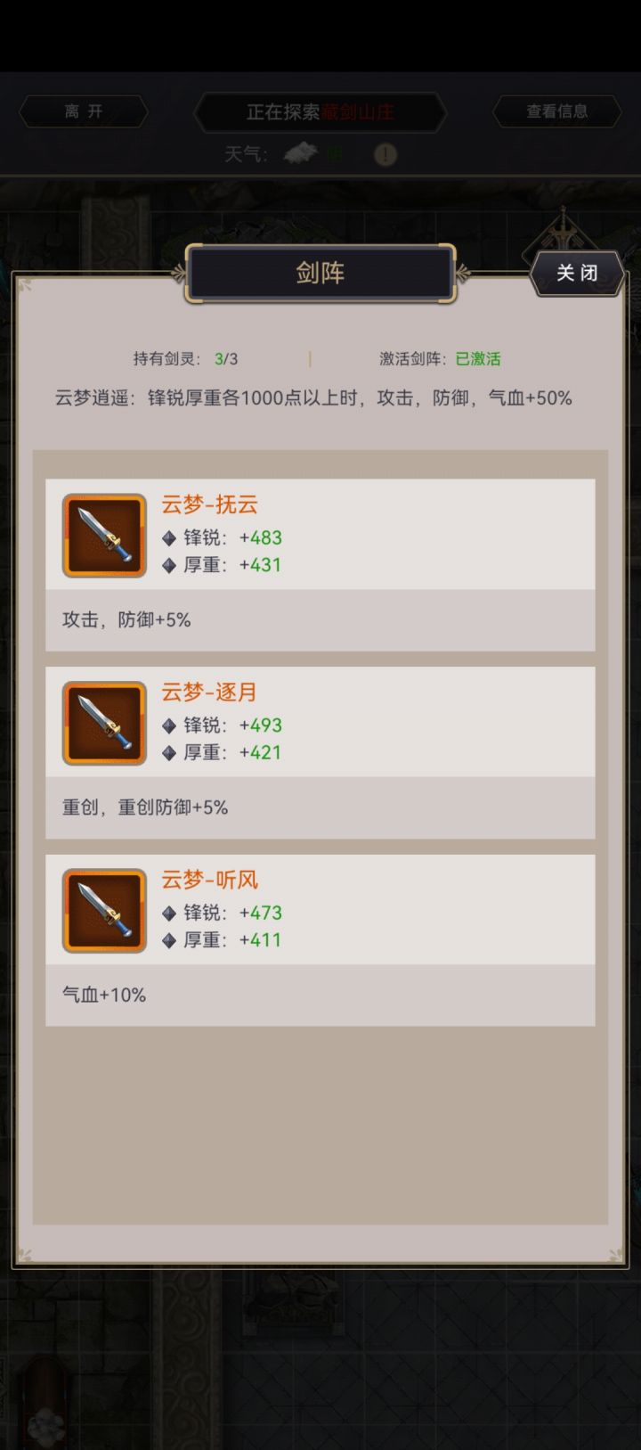 ①剑阵是侥幸凑齐了云梦,我的攻击和血量都是偏低的,云梦的属性增益非常明显,凑流光反而会有些重创溢出。说个凑云梦剑阵比较少被提到的点,打完4个黑衣死士、2个巨剑守卫,拿完3个盒子后是凑不够双1000的,推荐打左侧三个怪,公输奕文、苍桐长老、碧落长老,翻车概率比较低,打完三个是可以激活云梦效果;而打右侧公输奕武比较容易翻车,巨匠没有试过。