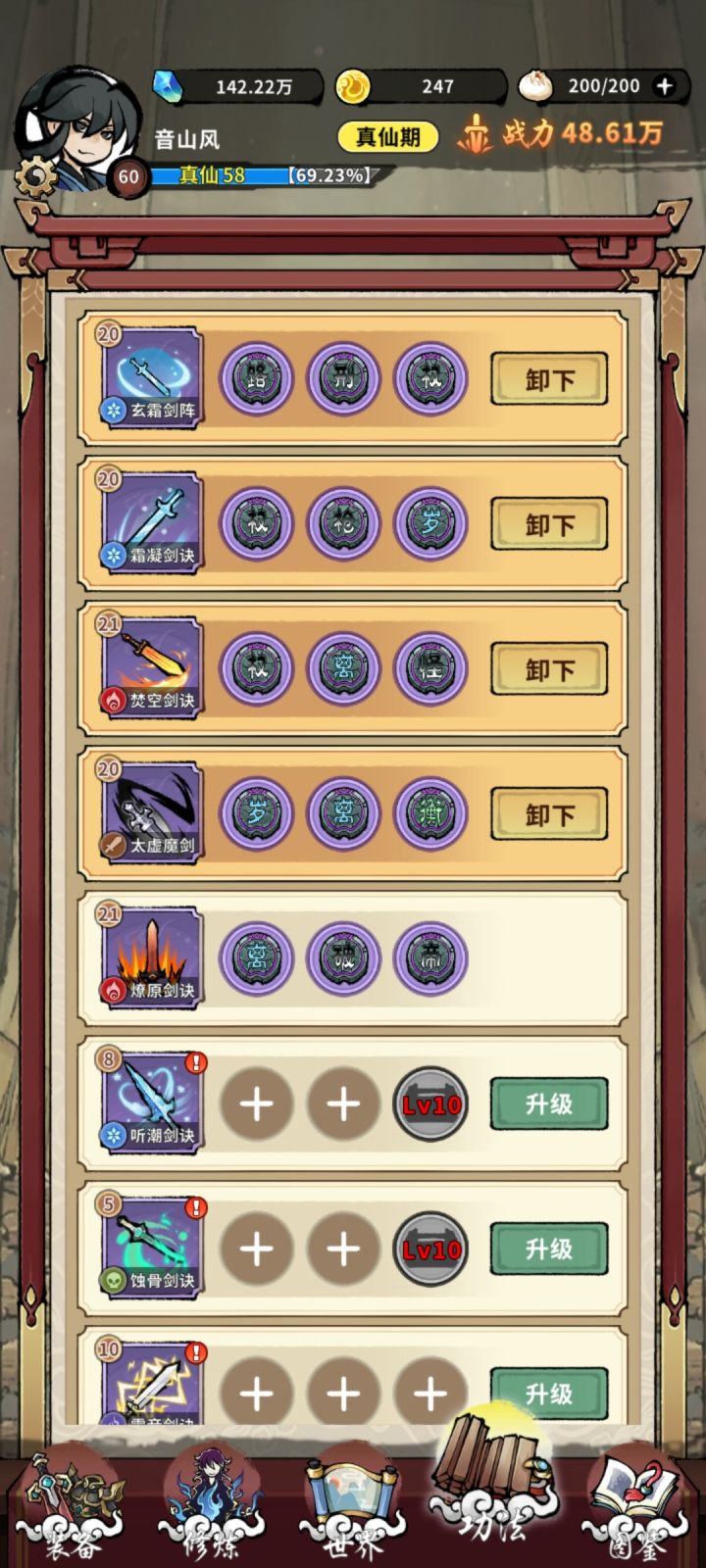 然后20-60就按这个频率来,买武器飞剑(找不到的可以筛选灵石和当前境界),打特殊副本拿技能,然后爆的其他装备在一点点换上来,速刷经验到60