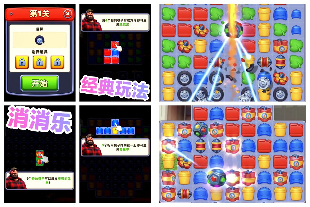 消除游戏的玩法非常经典,正常的螺旋桨,火箭,炸弹💣等等道具都和普通游戏没什么区别