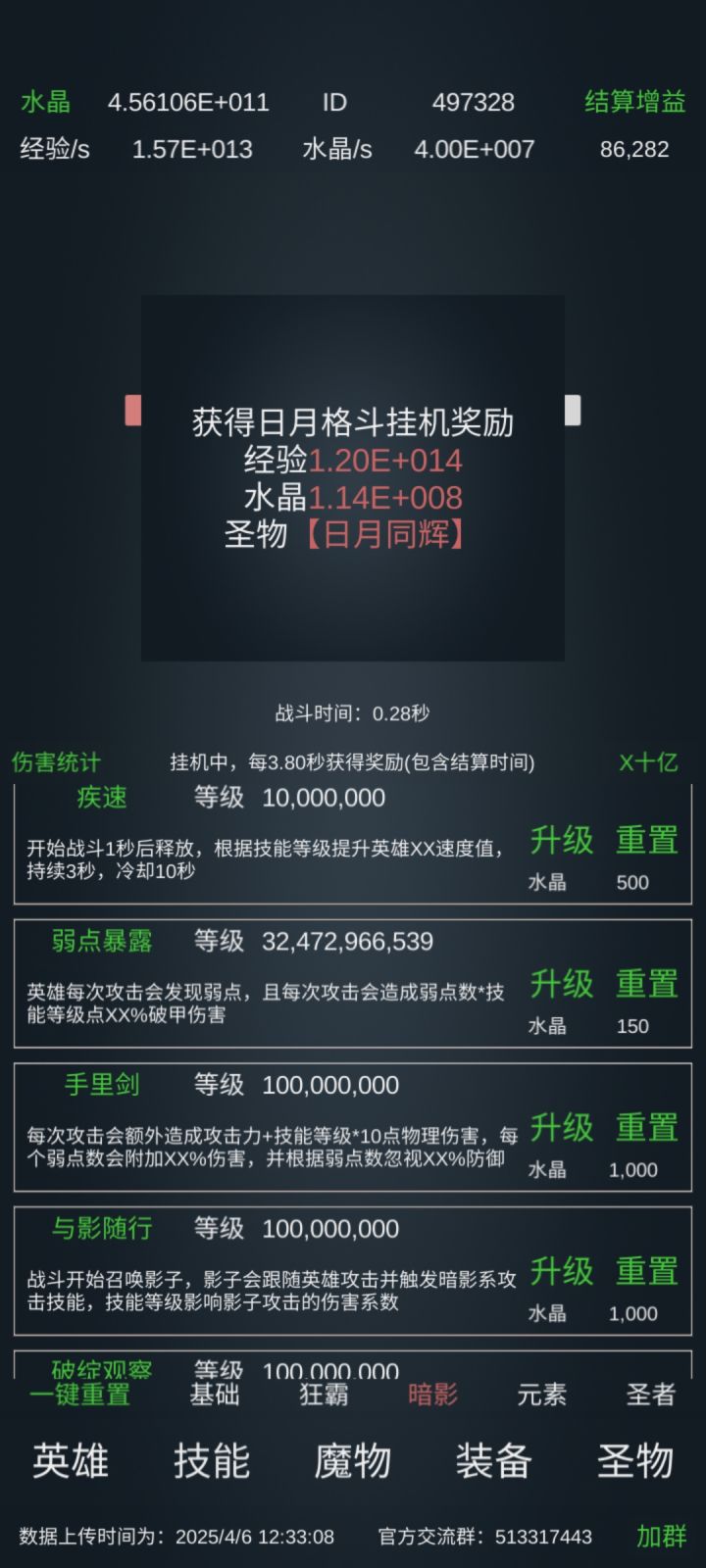 两怪差不太多,不过这个配置日月格斗需要赌一下,赌个4、5分钟,赌不过可以点一下元素盾或再挂一会儿深渊至宝(推荐),深渊至宝够不需要太高的配置。