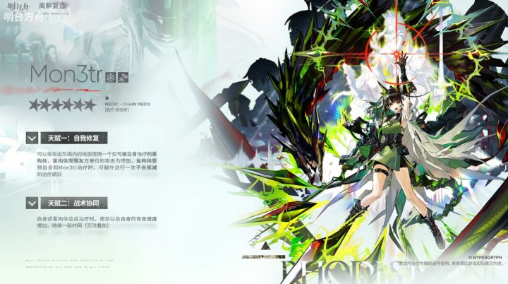 可以在攻击范围内的地面使用一个仅可被自身治疗的重构体,重构体周围友方单位的攻击力增加,重构体受到自身和Mon3tr治疗时,可额外进行一次不会衰减的治疗跳跃