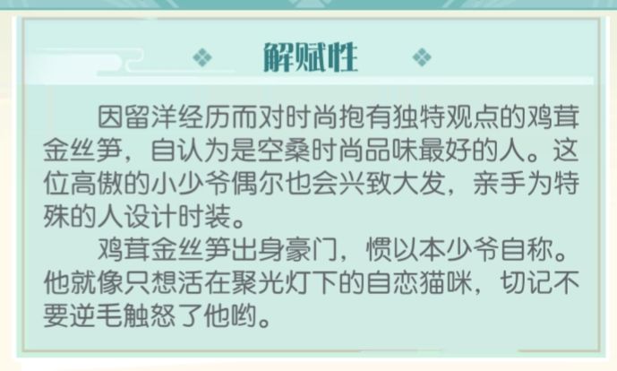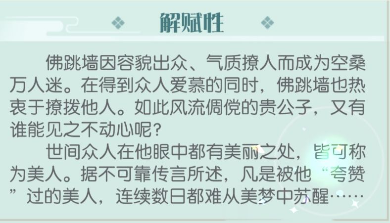 他追求美,认为“美之美者是世间至上之物”,他对你产生了情感,怀揣着爱意希望向你靠近,又害怕这种情感在你的眼中是“不美”的。他对你的在意程度已经超越了他自己的想象,他致力于给你打上他的标签,让所有人都知道你是他的所有物。看似高攻高防有来有回,实则早已芳心暗许,被少主迷的五迷三道。