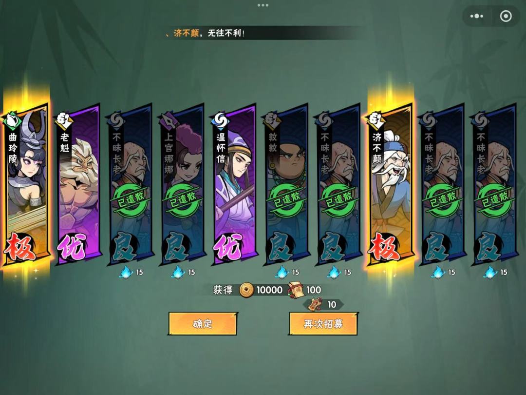 建号开始,新手引导之后开始输入兑换码,算上新手刚登陆的任务,大概能有3次友情招募十连抽,2次豪侠招募十连抽,上面的图就是开局最好的一次。但是即便是这样,也不足以支撑去争排名所以还是建议新手就开始囤积豪侠令,等待第一次活动抽满1轮拿宗师随机箱子和珍珠。随用随抽,太看脸了,可能有好的侠客,可能都啥都没有。试过豪侠令活动那周开始建号,除了请酒令其他都不动,到下一次豪侠令活动,可以抽满2轮。