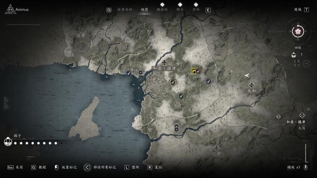 分地区查看,基本地图上有问号?标记,金色标记很显眼。