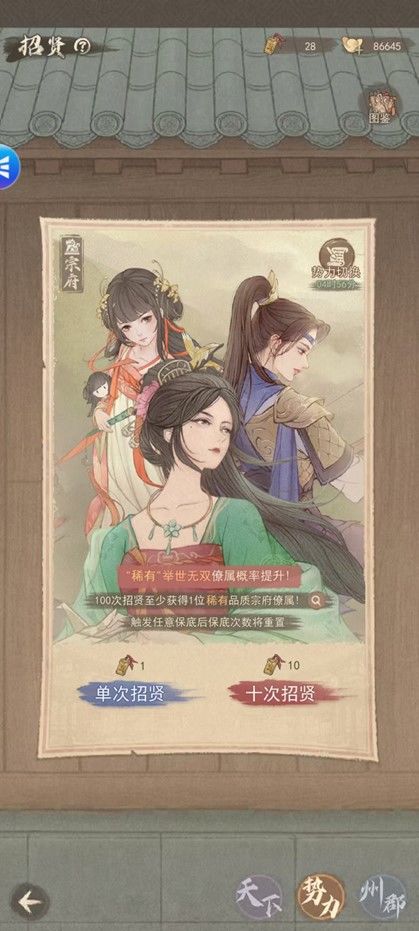 天下与势力转换:天下招募消耗招贤通宝,每 30 次至少可获一位最高品质僚属;势力招贤能自主选择抽取的僚属势力。先用天下招贤招募大量普通僚属后,转换为势力招贤,可能收获稀有僚属惊喜。