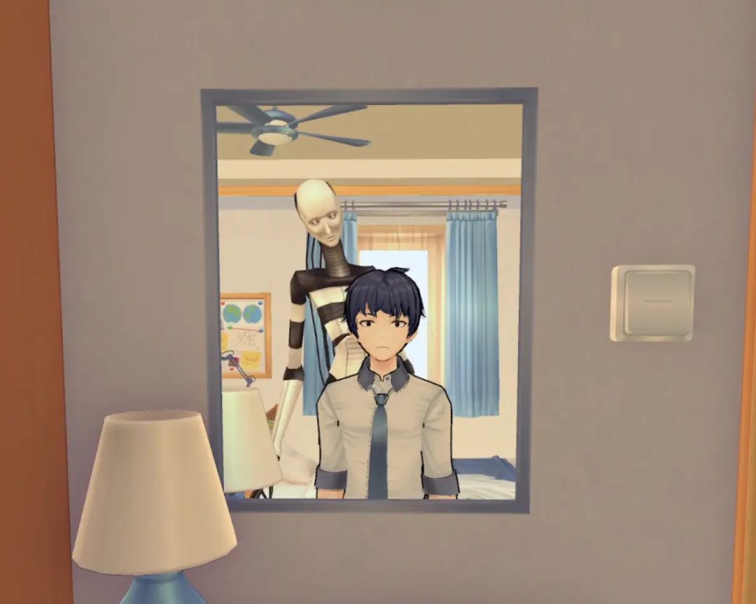 在男主房间镜子前挂机一段时间,会出现一个鬼,在背后看着男主,2-3秒就消失了,突然出现还是比较吓人的-章节-我,在游戏里?此段没有比较吓人的地方,只有在走廊那段冒出来短发米塔,硬着头皮往前走就行了-章节-开端-从这关开始就比较吓人了-当米塔让你做完选择题(第一次玩只能选择打开柜子)打响指之后,会在厕所看到一个上吊的假人