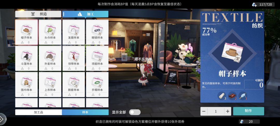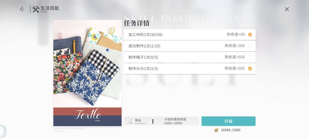 “制作头巾”与“制作帽子”希望可以更正为“制作头巾样本”与“制作帽子样本”,不然很容易与服装混淆,还有那个制作成功10次只计算了制造服饰的,制造样本成功不算在内,希望可以优化,毕竟一件服饰的成本实在太贵了!!升个二级需要这么多材料在前期根本算不上合理吧!
