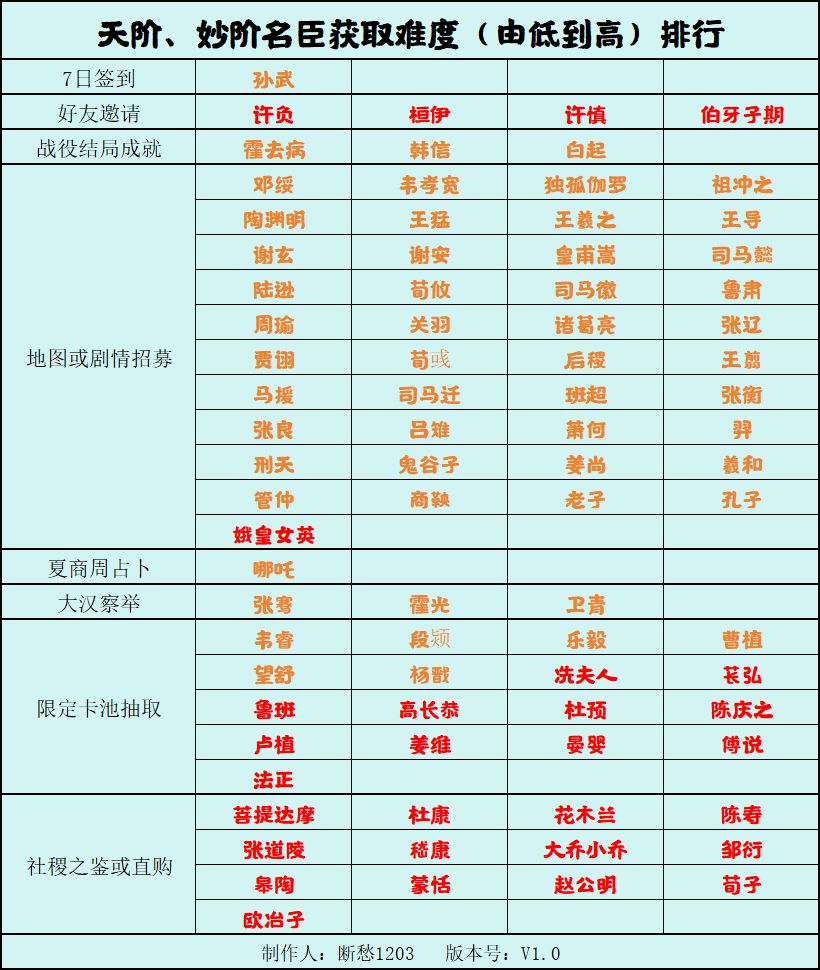 【无悔华夏】名臣获取难度排行~卡池抽取必看