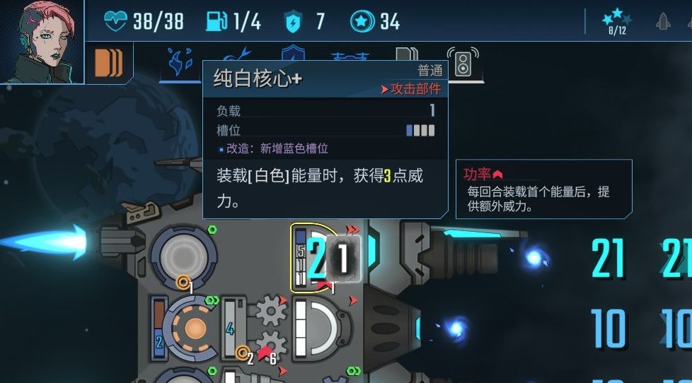 如果战斗的策略在于分配数字,那么构建的策略就在于如何搭配部件,我们3*3的飞船上可以装载自己获得的部件并调整位置,很多部件都是有连锁反应的。