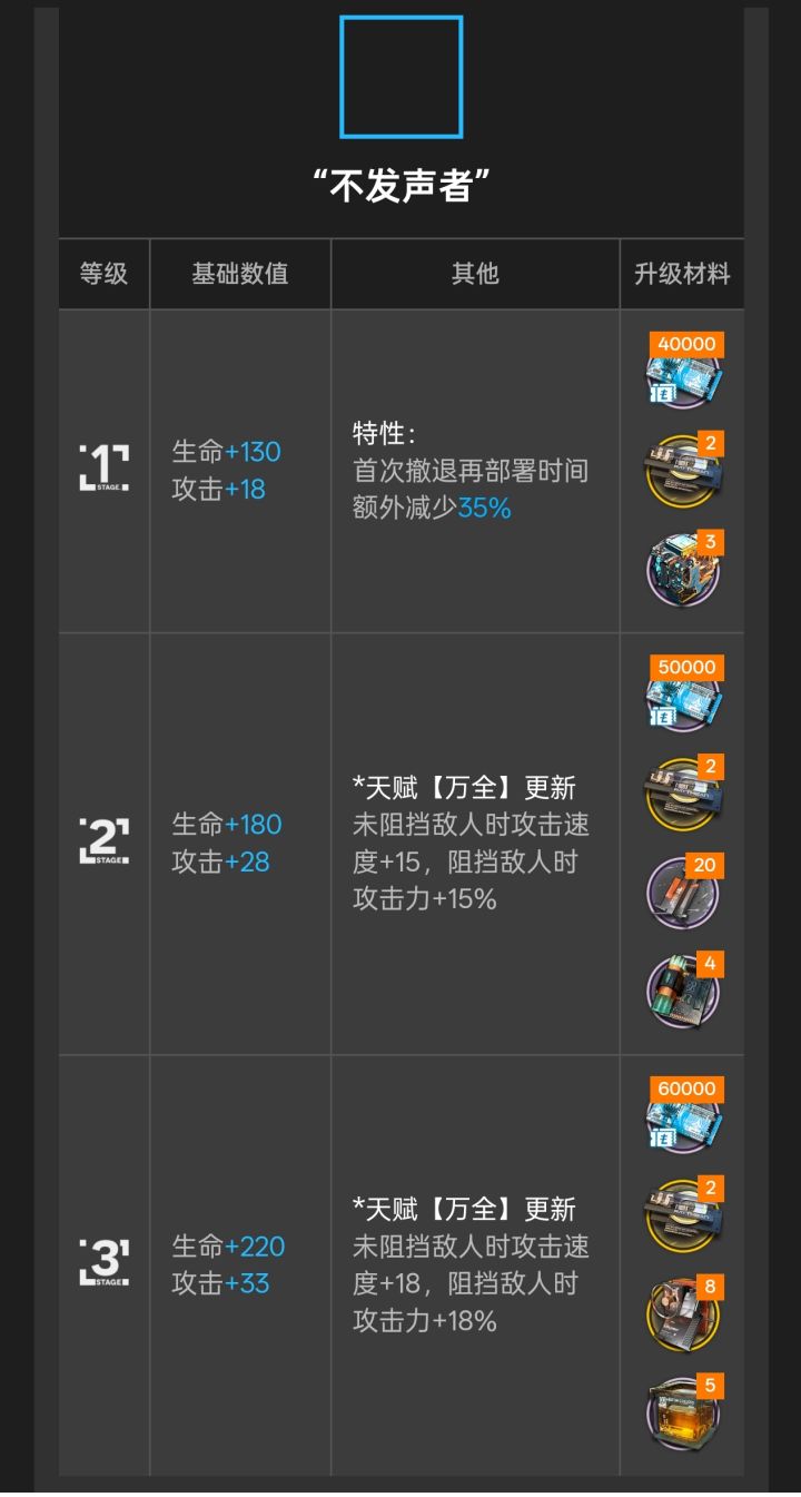 剩下的问题就是首次部署,3技能效果就是首次部署时不消耗部署费用,放置一个影哨后离场并立刻刷新再部署时间。也就是很有可能3技能是吃不到这个天赋加成的。当然也有可能可以触发,但是出现bug了要等修复。