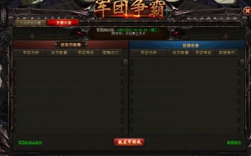 4. 军团争霸军团争霸是军团玩家进入雷霆疆场进行争霸的活动,以军团为单位,不同军团可以结盟,组织争夺战神之柱和圣战神石。报名:玩家在军团战开始前报名,报名可以通过右上方军团争霸进入报名界面;
