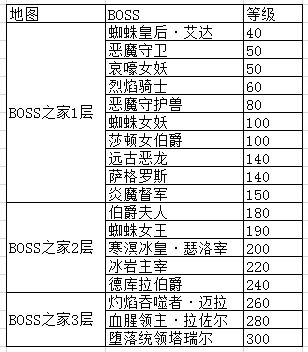 BOSS越高级,掉落的装备也越高级,产出的幻兽也更极品哦;时刻留意BOSS面板的刷新信息,抢BOSS快人一步!BOSS之家:BOSS之家是特殊的BOSS副本地图,可以通过卡萨诺城NPC-BOSS之家(155,238)传送进入;