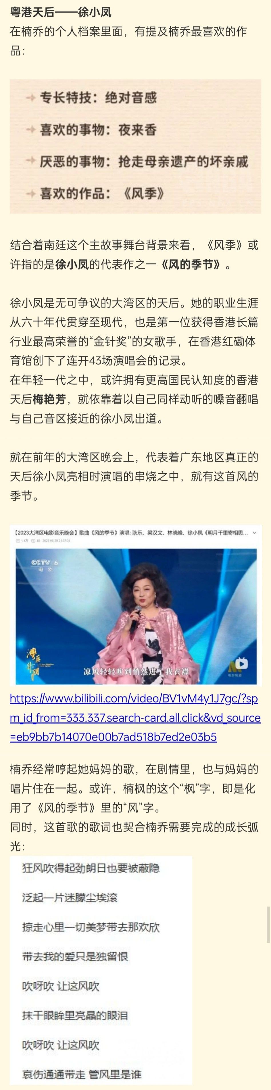 以及楠乔最喜欢的作品《风季》(并非楠枫所唱),原型是粤港天后徐小凤的《风的季节》
