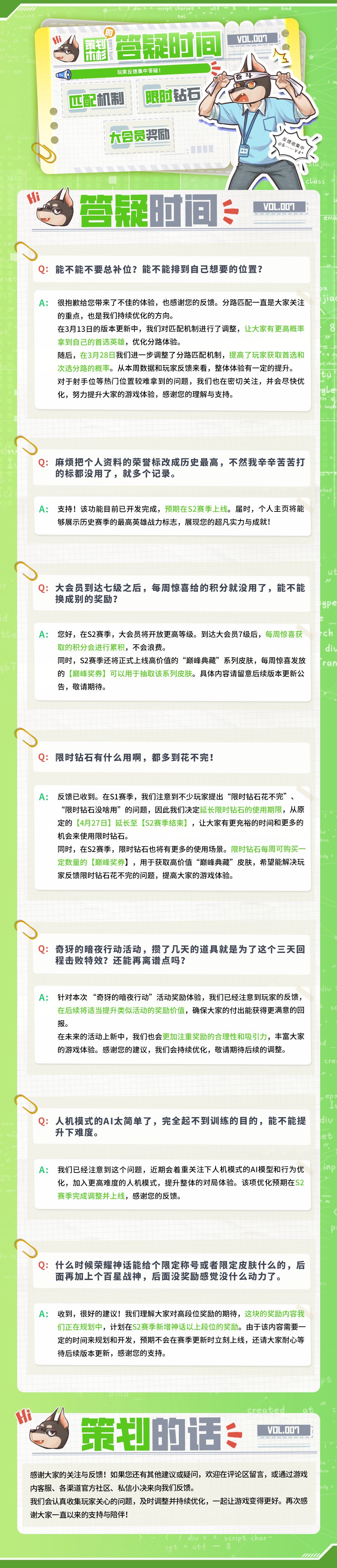 不过假期里娜娜也没有忘记身上的任务!揪住了正在度假的策划木杉,为大家带来最新的策划答疑。本期战斗策划木杉针对匹配机制、限时钻石、大会员奖励等近期友友们关心的问题进行了解答,快来和娜娜一起康康~