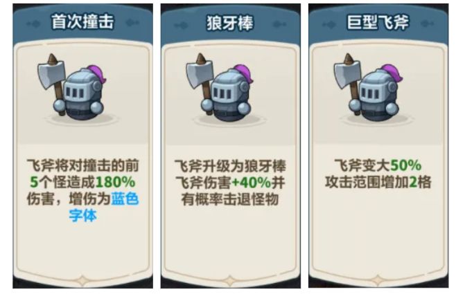 【三板斧】:城墙血量每降低10%,所有骑士迅速连扔3次飞斧。
