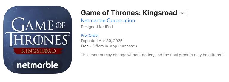 根据App Store显示,《权力的游戏:王者之路》游戏预计4月30日于海外正式上线,安卓版目前在加拿大/英国地区谷歌商店提供下载。