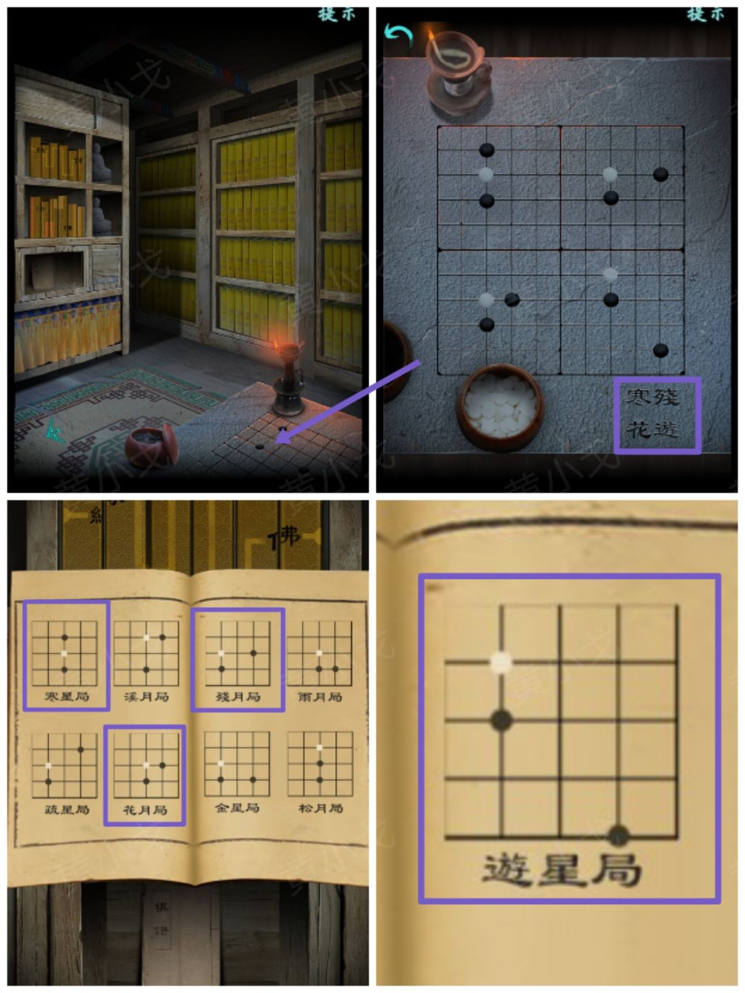 36.点击棋盘,根据上面的提示,结合棋谱上的线索,摆好寒残、花游棋局