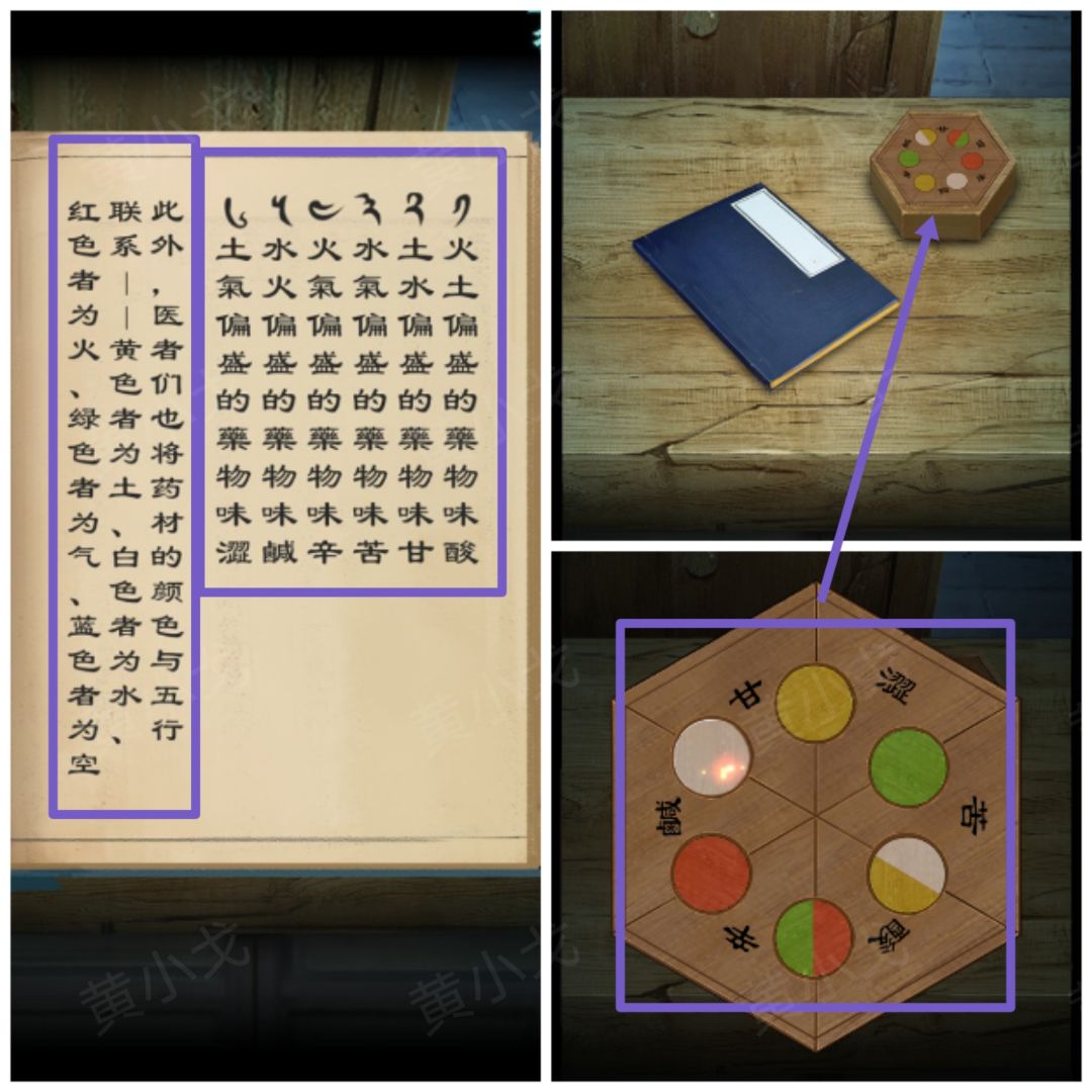 38.点击药柜,放好【木盘】;根据【药材药方】上的线索抓药,获得【药材】