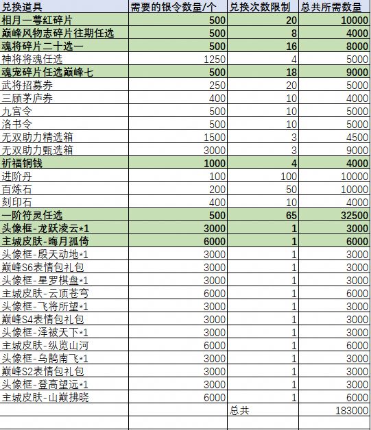 兑换所有奖励是183000银令,如果参与过前六期的老玩家只需要138000银令