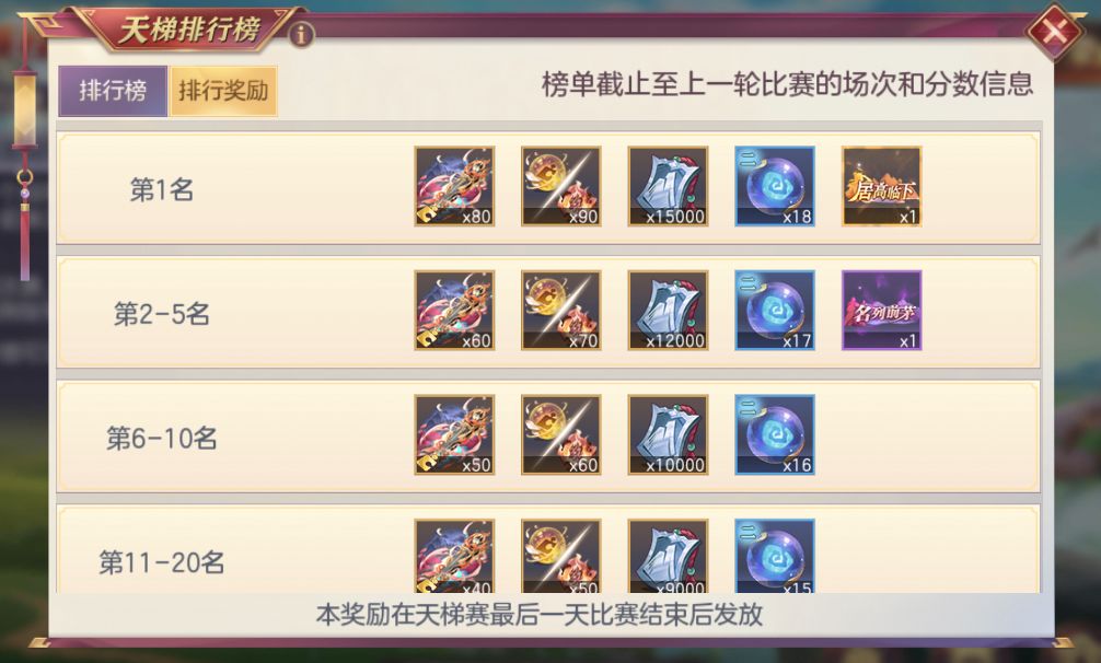 每日获取银令为5000,一共持续5天,共25000银令,晋级一次是5000,最高20000,排名奖励最低为6000,最高为15000