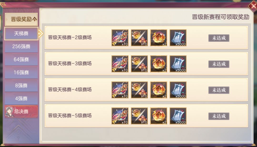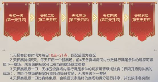 1.巅峰夺魁天梯赛的匹配范围为赛区,初始大家都会被平均分配到天梯一级赛场,根据每日排名决定是否可以晋级下一级,但是没有晋级玩家也可以继续参加比赛,直到第五日,会从天梯五级中选拔出排名靠前的玩家进入到后续淘汰赛阶段。