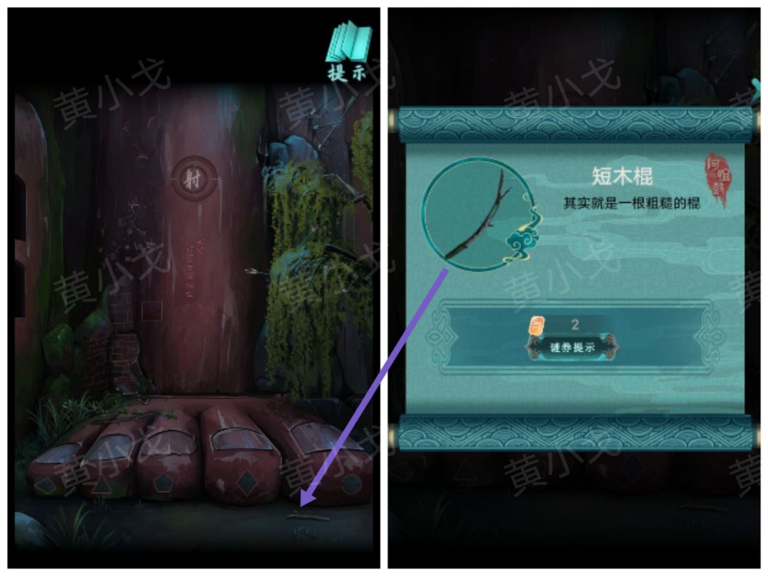 6.点击大佛腿上带有射字的箭靶,用【弓箭】触发机关;根据小佛像上的线索,按顺序射击箭靶