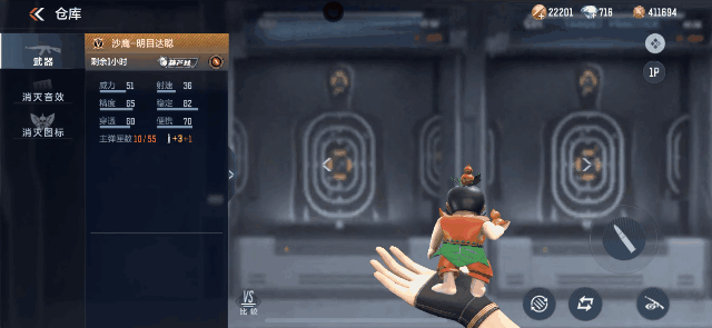 在挑战模式中,可以连发开火。除此之外,沙鹰-明目达聪还拥有专属杀敌图标和专属可爱开镜HUD,十分酷炫。