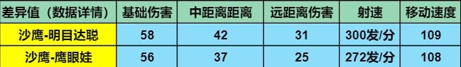 在沙鹰-明目达聪与原版武器沙鹰-鹰眼娃两把武器游戏中的数值对比我们发现,在都未点满精通的情况下,觉醒后的沙鹰-明目达聪在基础伤害、中距离伤害、远距离伤害、射速和移动速度方面都要略高于原版武器。