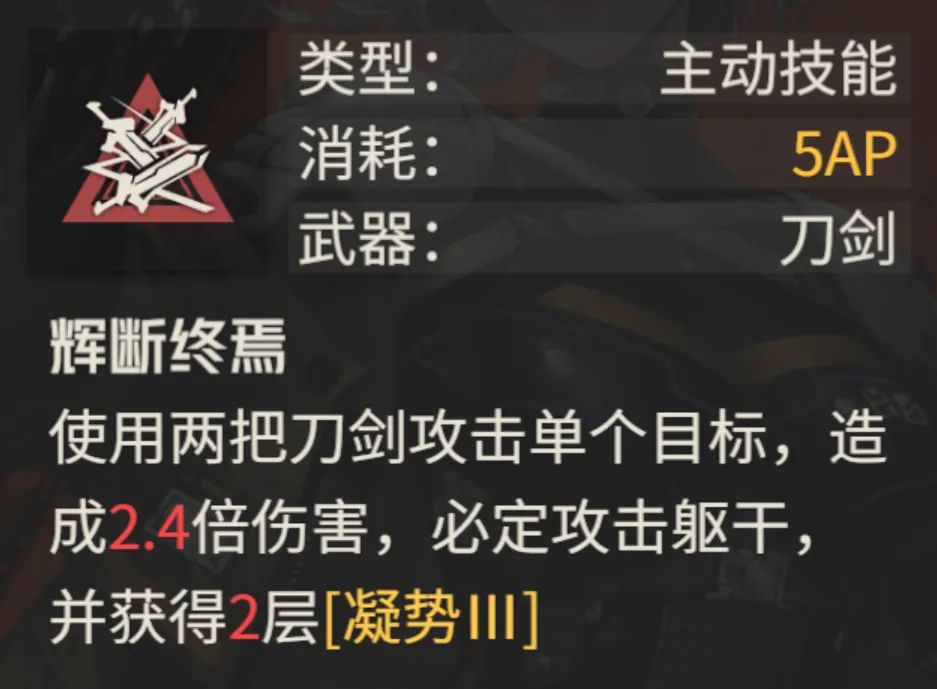 - 艾达除了上述的两个能够直接点头的技能外,其【辉断终焉】的点头爆发能力也极为可观,单次且单体的伤害要远远高于【星坠闪】或【崩穹斩】,但这个技能在实战中到底要不要带却是一个值得商榷的问题,毕竟【星坠闪】的快速位移+【崩穹斩】的群体输出,外加一个15%增伤的被动【碎钢】应该才是艾达的常规技能组合,而【辉断终焉】则应更多用于需要快速叠加出5层【凝视】buff时或多次攻击中的最后一击,需要视情况综合考虑