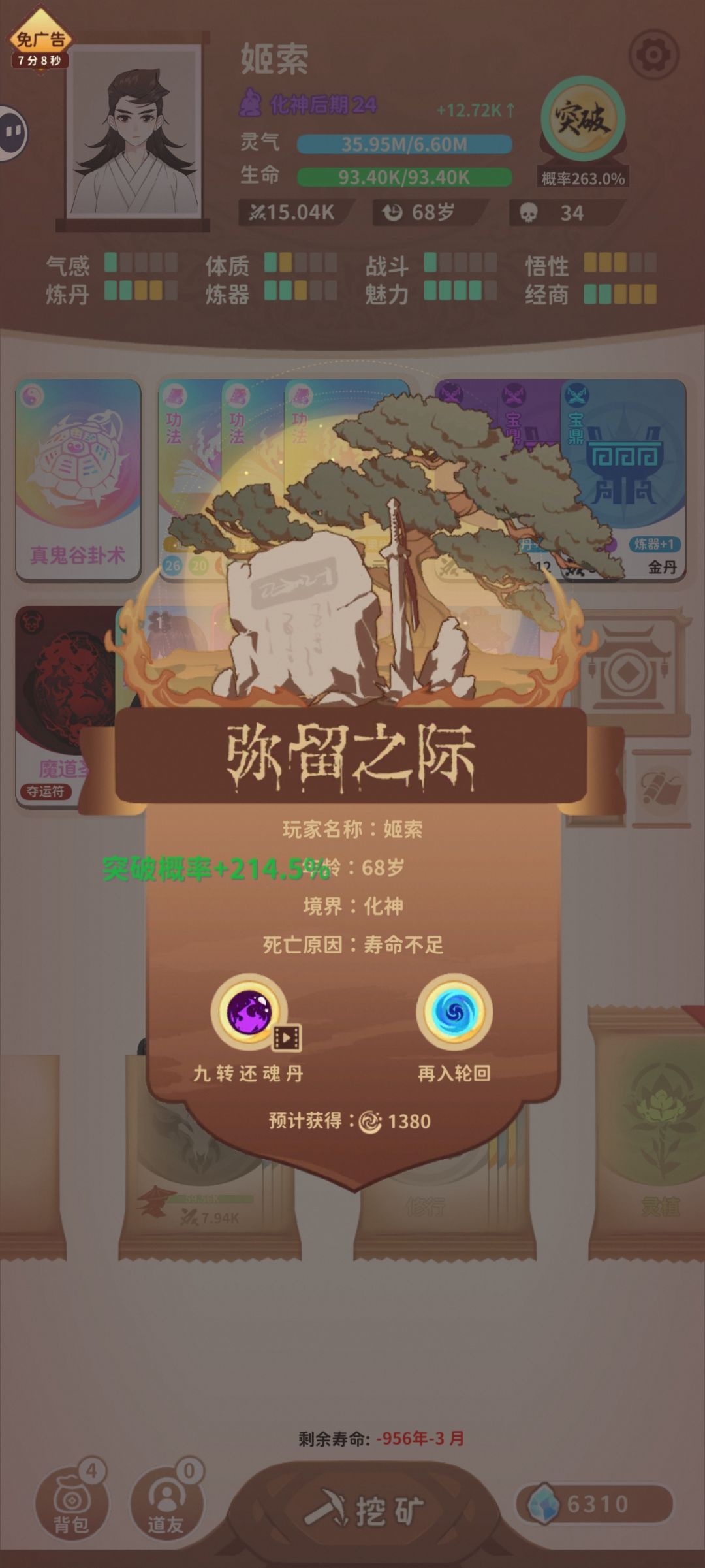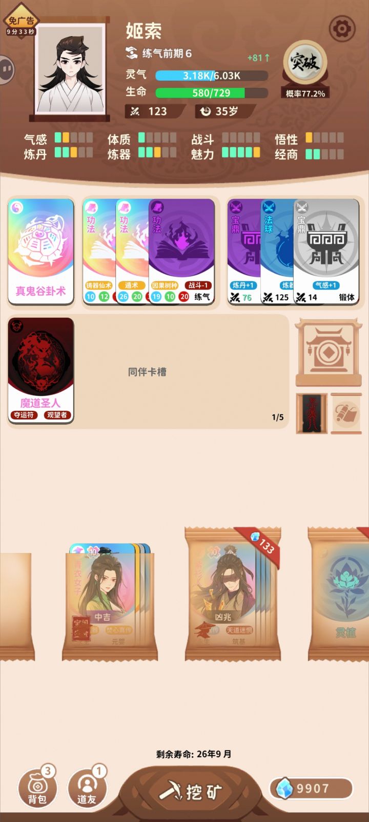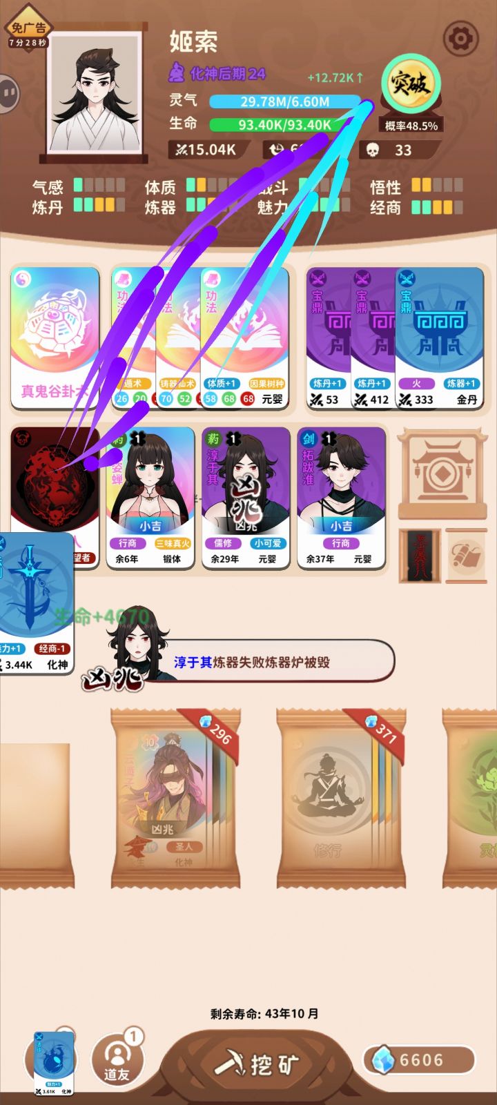 (境界很低能减缓人物卡出现的几率。如P1,凡人1大概率,最到35年附近他才来第二次)