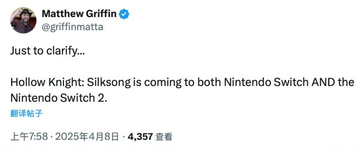 负责本作营销发行的Matthew Griffin出面澄清,本作除了 Nintendo Switch 2 以外,同样会登陆 Nintendo Switch1。