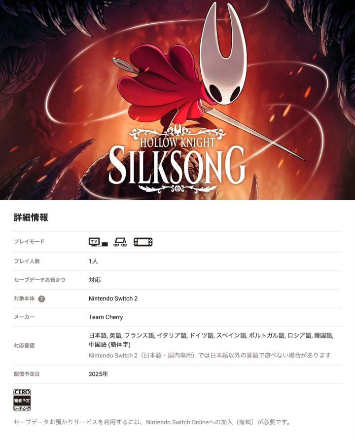《空洞骑士 丝之歌》据发布会等消息预计2025年发售,对应平台目前只标注了 Switch 2。